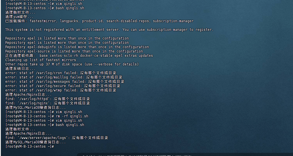 这个脚本使用方法,首先你先创建一个文件比如vim qingli.sh使用这个命令创建一个这样的文件,然后把脚本复制粘贴到里面,之后输入bash qingli.sh执行一下这个脚本,然后可以运行了,我的这个路径写的和大家的有可能不一样,如果你使用的是宝塔的话,我建议查一下宝塔的相关路径,比如宝塔的日志路径,然后你再把这个脚本上面的路径给他改一下。