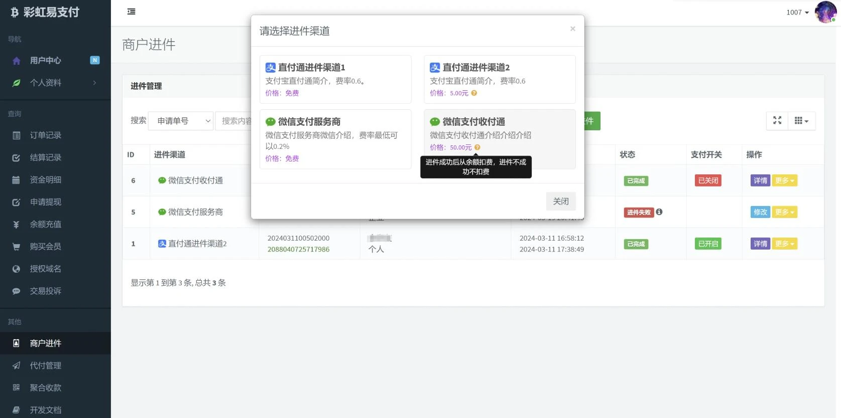 2、用户组的支付通道需要改成“用户自定义子通道”,这样用户进件之后才能使用进件成功的子商户发起支付。若用户在同一个支付方式下进件了多个子商户,则随机使用子商户发起支付。